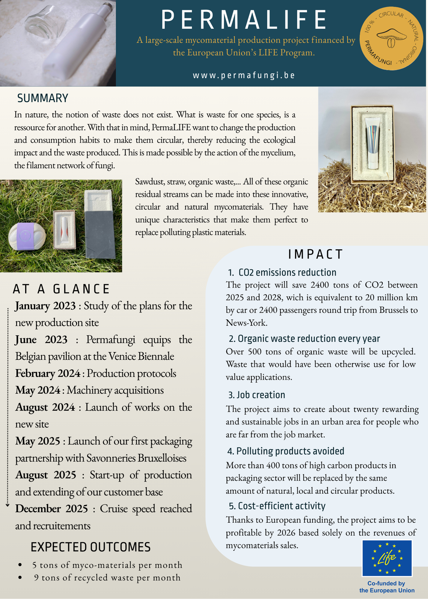 PermaLife est un projet de production à grande échelle de mycomatériaux financé par le programme LIFE de l’Union Européenne.