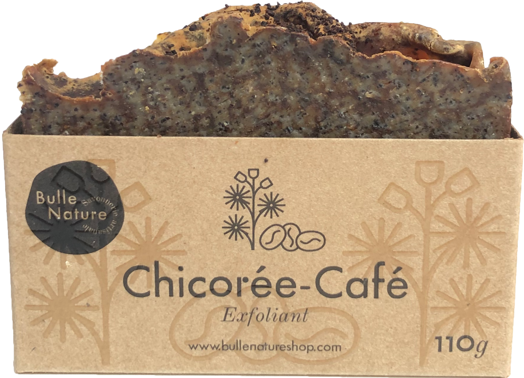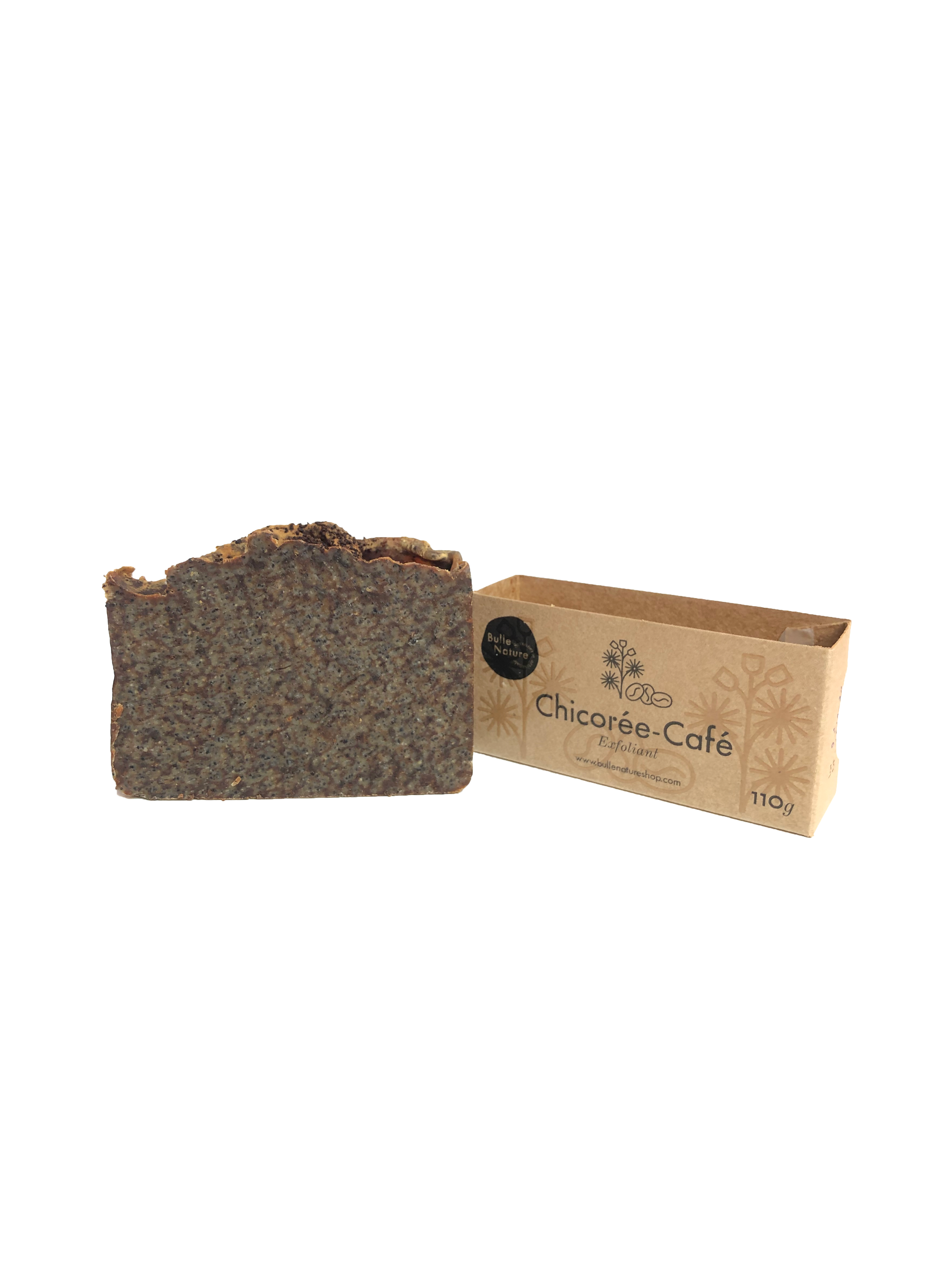 Ce savon merveilleux est composé exclusivement de produit biologique. Grâce aux vertus de la chicorée et du marc de café, votre corps et vos mains seront exfoliés en douceur mais également hydratés en profondeur. Surgras à 7%, ce savon contient de l’huile d’olive, de l’huile de tournesol, de l’huile de noix de coco, de l’huile de ricin ainsi que du beurre de cacao.